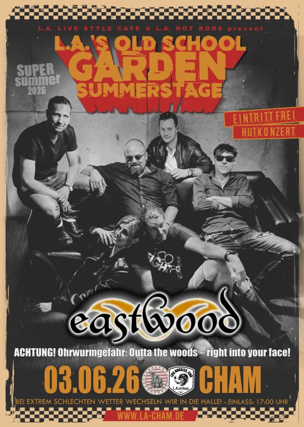 Rock, Blues, Folk – einmal alles kräftig umrühren und heraus kommt eine ganz neue und doch völlig vertraute Mischung mit dem Namen „eastwood“. Die Combo aus dem Landkreis Cham spielt sich seit 2003 mit ihren Songs in die Herzen und in die Beine ihrer Fans und vereint das Beste aus mehreren Genres. E-Gitarren und Mandoline, packende Drums und mehrstimmiger Gesang, Rocksongs und Balladen, Punk und Piano – bei eastwood ist alles möglich, Hauptsache es groovt! Die Band überzeugte schon immer durch ihre Eigenkompositionen, deren Qualität auch überregional nicht unbemerkt blieb und war unter anderem live beim BR2 „Zündfunk“ oder bei der „Gute Laune Macher-Tour“ von Antenne Bayern mit über 10 000 Zuschauern zu hören. Mit freshem Line-Up und neuen Songs startet eastwood in die Live-Saison 2024 und verspricht wie immer unvergessliche Abende voll echter, ehrlicher Musik mit Ohrwurmgefahr: Outta the woods – right into your face!