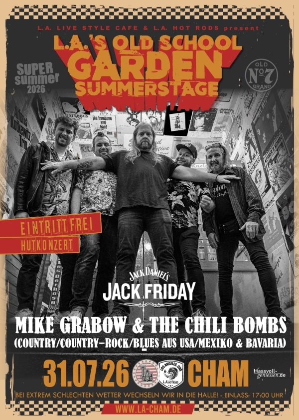 Ein absoluter musikalischer Leckerbissen der besonderen Art erwartet Euch bei dieser Band. Mike Grabow geboren in Nevada und mittlerweile seit 20 Jahren wohnhaft in Mexiko. In Playa del Carmen und Los Cabos ist er der Nummer 1 Musiker an dem guten Geschmäcker nicht vorbeikommen. Seit 2017 lassen wir diesen Ausnahmekünstler bereits zum 6.Mal einfliegen, um mit seinen Chili Bombs (Jo Morgenschweiss, Oli Schmid, Michael Weigert und Tom Preissl – allesamt bekannte Musiker aus dem Raum Regensburg) in 2026 eine 4-wöchige Tour in Deutschland/Österreich zu spielen.