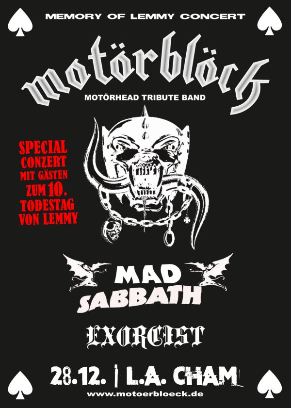 Der 28.12. ist für alle Motörhead Fans ein ganz spezielles Datum. Heuer jährt sich der Todestag von Motörhead Mastermind Lemmy Kilmister zum 10. Mal. Zudem feierte auch Motörhead selbst ihr 50-jähriges Bandjubiläum. Und auch Motörblöck sind seit über 30 Jahre auf den Bühnen in Deutschland und Österreich unterwegs.